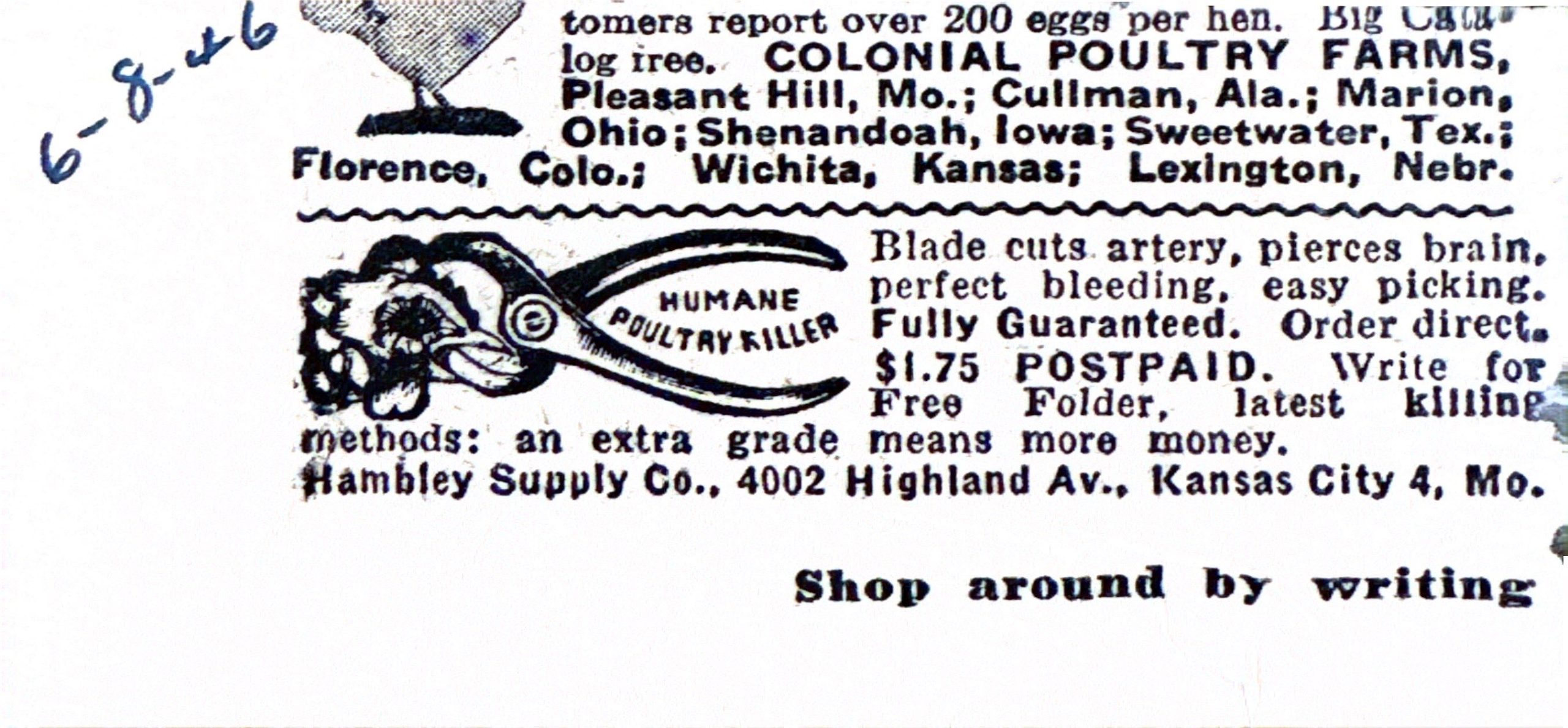 And there’s one additional document of interest, a small advertisement cut from an unknown source. It offers a “humane poultry killer” available for $1.75 from a company in Kansas City, Missouri.