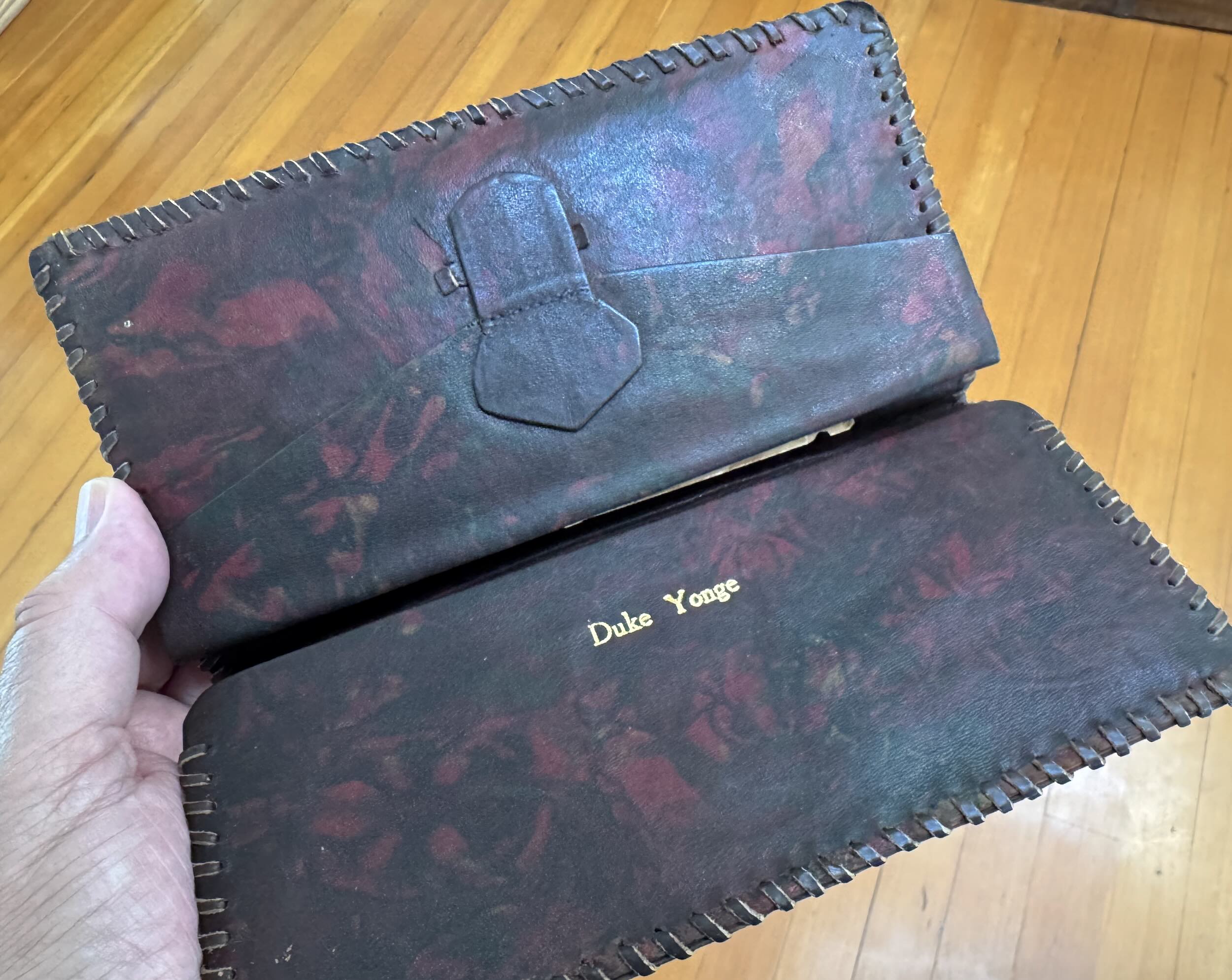 But instead I found an old leather wallet and when I opened it, the name of my grandfather–my mom’s father, Duke Yonge– was embossed on the interior in gold letters.