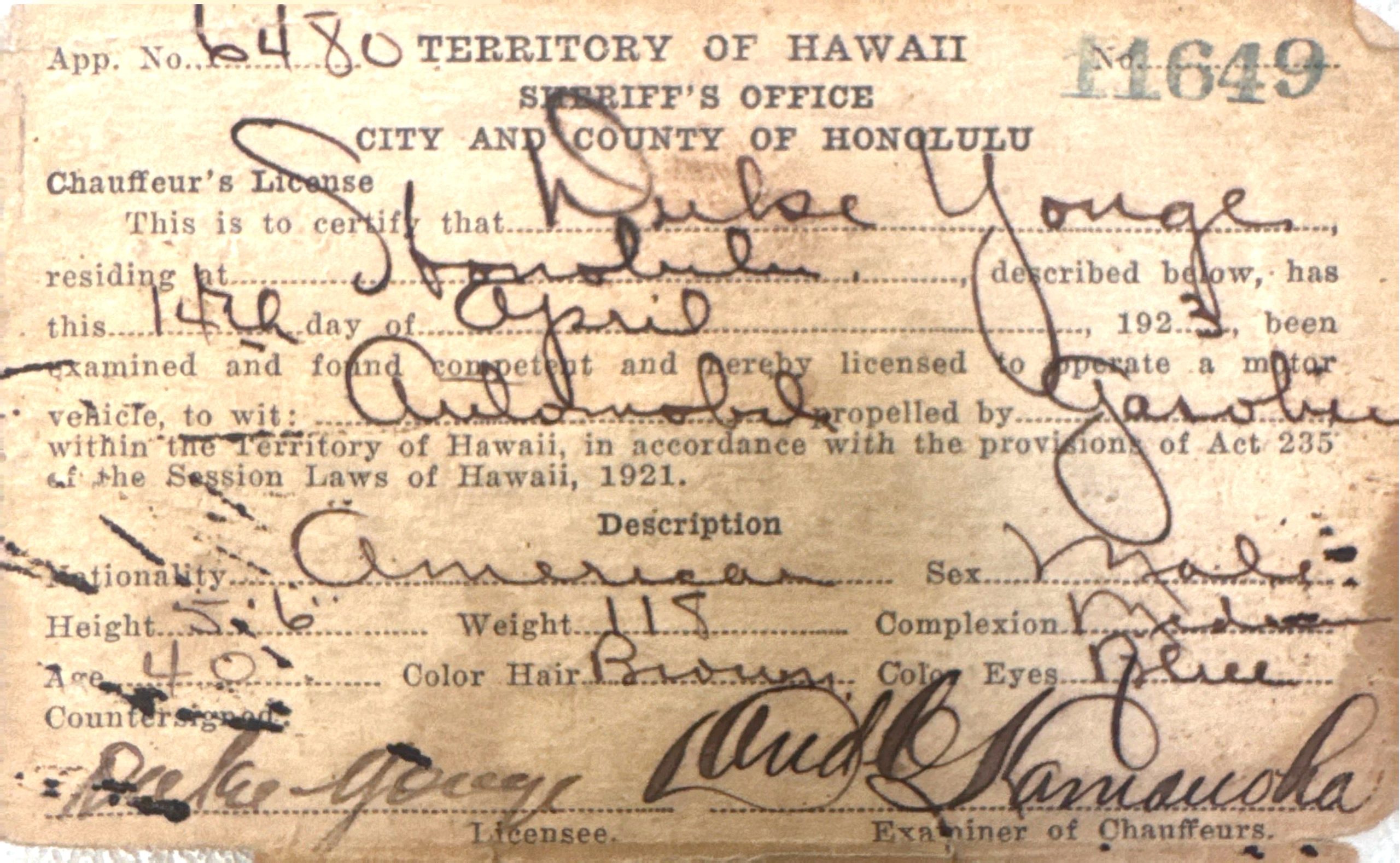 In April 1923, he obtained a “Chauffeur’s License” from the Sheriff’s Office in Honolulu, which stated he had “been examined and found competent and hereby licensed to operate a motor vehicle, to wit, Automobile propelled by Gasoline….” There were blanks on the form where the words “automobile” and “gasoline” were written in by hand.