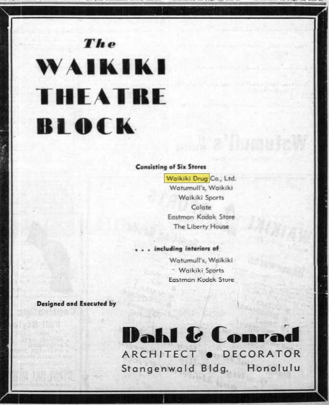 The first mention I was able to find was an announcement in Honolulu Star-Bulletin about the opening of a new shopping area to include the new Waikiki Drug Store. It was one of several stores to open for business around the Waikiki Theater in September 1937.