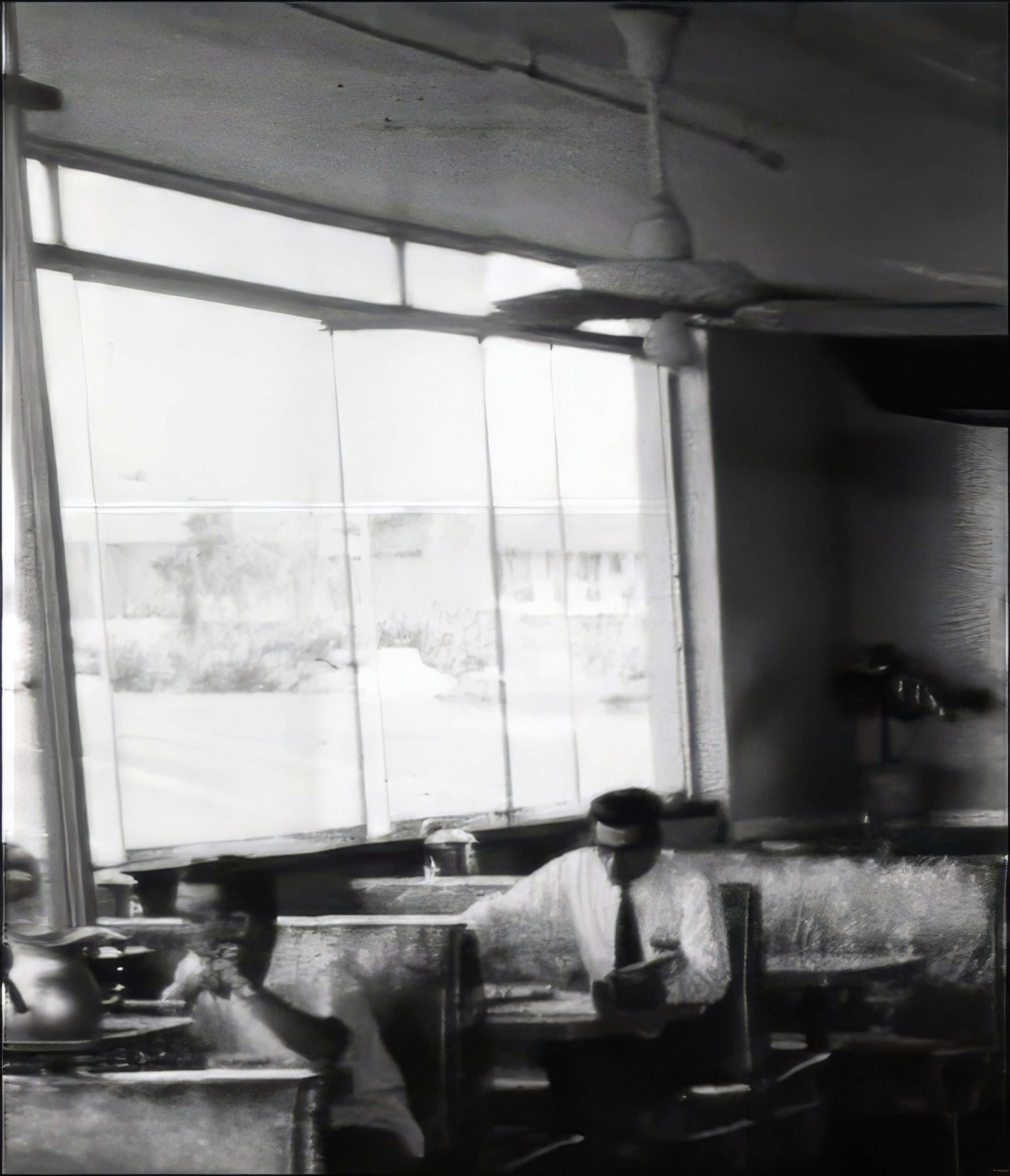 Kau Kau Korner detail: It’s 50-50 on the white shirt & tie. And a mystery view out the window in the background, just hinting at what that busy corner was like in the day.