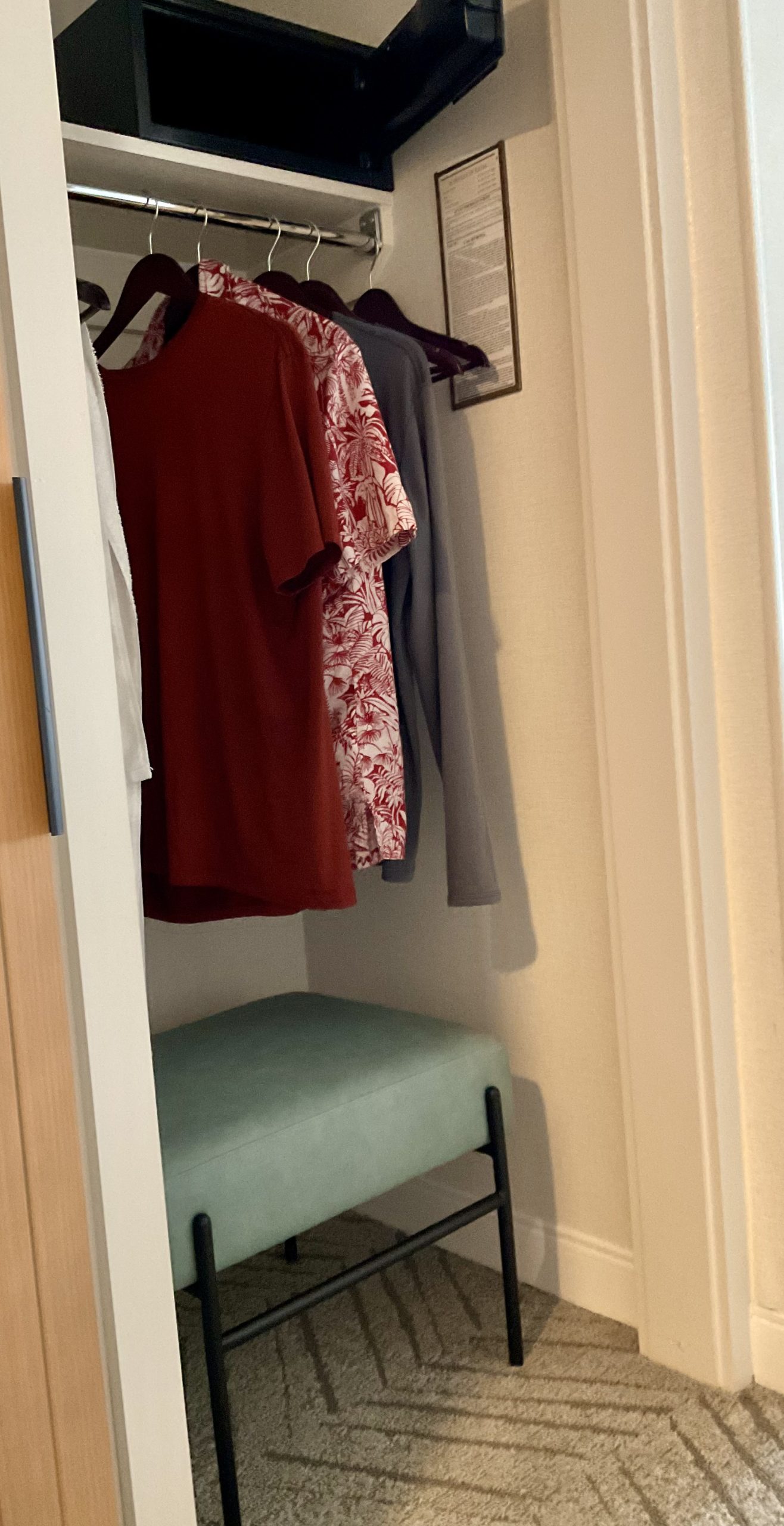 But here at the Marriott on Ocean Blvd. in Long Beach, it’s on the top shelf in the small closet, above the area provided to hang clothes. It works fine for me. But it’s simply too high to be convenient for a short person (like me wife), who would have to stand on a chair or something to reach into it. I think she could enter a code to lock or unlock it, but she can’t see inside it, and it’s too high to for her to reach and find items by feel.
