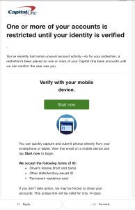 The only thing I would check if I received that email is my credit report. It would be addressed to Meda by name if it was legit, and they wouldn’t ask to upload ID in the email. You could try going to CapitalOne website directly and attempt to reset the password with that email address, and it will probably say there is no associated account.