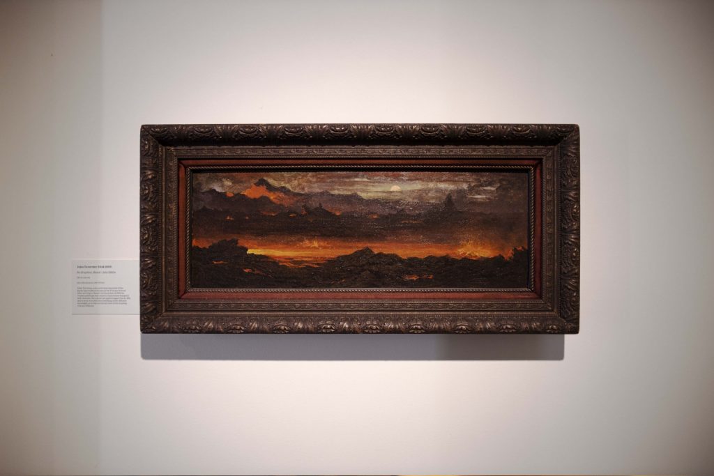 In 2016, HoMA unveiled the exhibition Charles Furneaux and the Sublime, showcasing the fiery Hawai‘i volcano scenes that have intrigued viewers since Furneaux began painting them in the late 19th century. In a blog post announcing the exhibition, Furneaux’s paintings are described as “among the most sublime depictions of smoldering lava pools, lightning bolts over the ocean, steaming vents and heavy clouds signaling the active presence of the volcano.” At the time, the exhibition debuted a major museum acquisition—the untitled painting by Charles Furneaux (pictured below) that underwent careful conservation by Larry and Rie Pace.