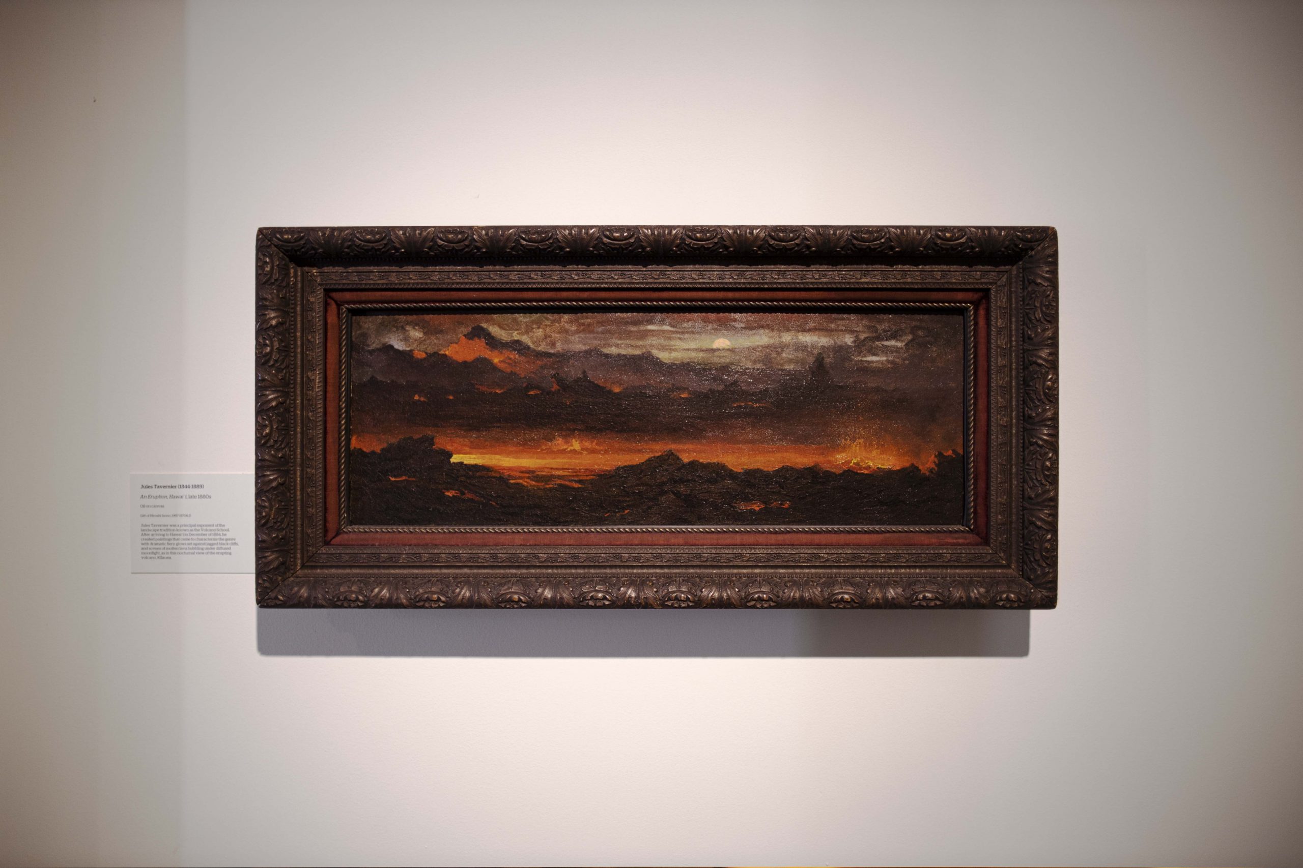 HoMA has three works by Volcano School painters currently on view: Jules Tavernier’s An Eruption, Hawai‘i, Ambrose Patterson’s Mount Kilauea, The House of Everlasting Fire, and Charles Furneaux’s Untitled, all displayed in the John Dominis and Patches Damon Holt Gallery of the Arts of Hawai‘i.
