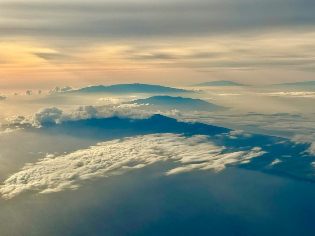 Closest to the camera is Molokai, with its mountainous east end in clouds. Behind Molokai are the West Maui Mountains, and behind them is Haleakala. Next are the Big Island peaks in the distance, Mauna Kea and, to the right and only partially visible, Mauna Loa.