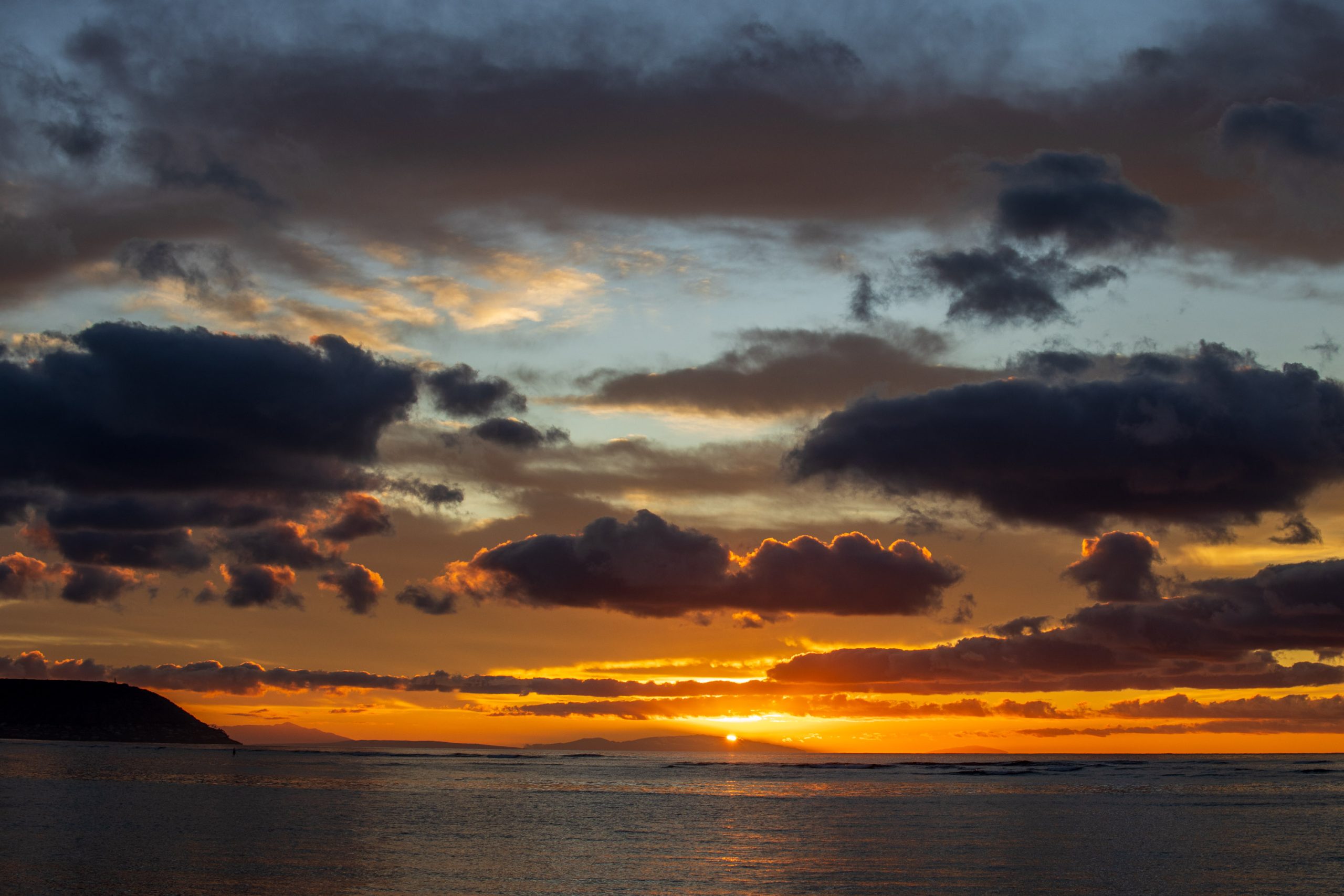 Closest to the camera is Molokai, with its mountainous east end in clouds. Behind Molokai are the West Maui Mountains, and behind them is Haleakala. Next are the Big Island peaks in the distance, Mauna Kea and, to the right and only partially visible, Mauna Loa.