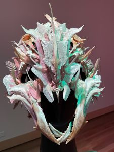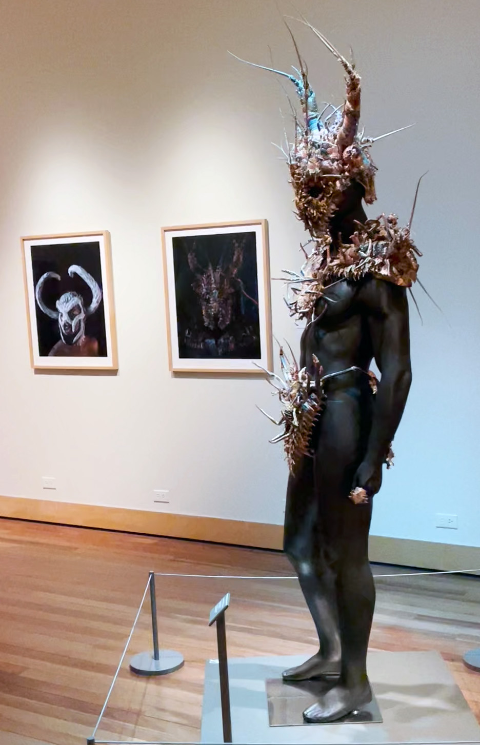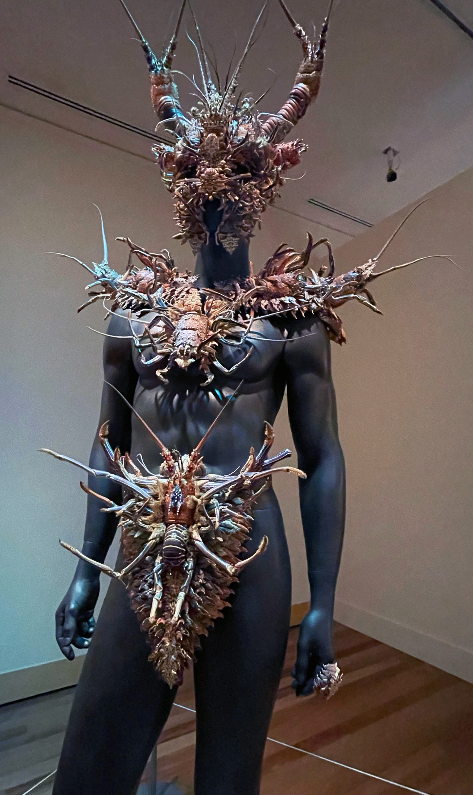 The lobster shell pieces, displayed on a lifesized manikin, is amazing and provocative.
