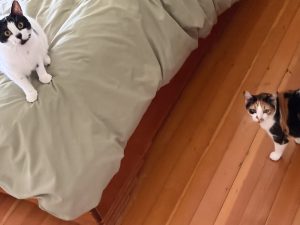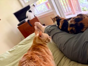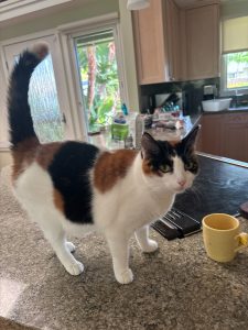 Kinikini reacts the most to our returns because he hides from our cat sitters. The three females–Kali, Bessie, and Kiko–all accept treats and pets even in our absence. But Kinikini is a hard case. He carries the lessons of his early years in a cat colony. Don’t trust any of those humans unless they’ve proven themselves. The result is that our cat sitters almost never even catch a glimpse of him, and he certainly doesn’t get any of those treats or pets.