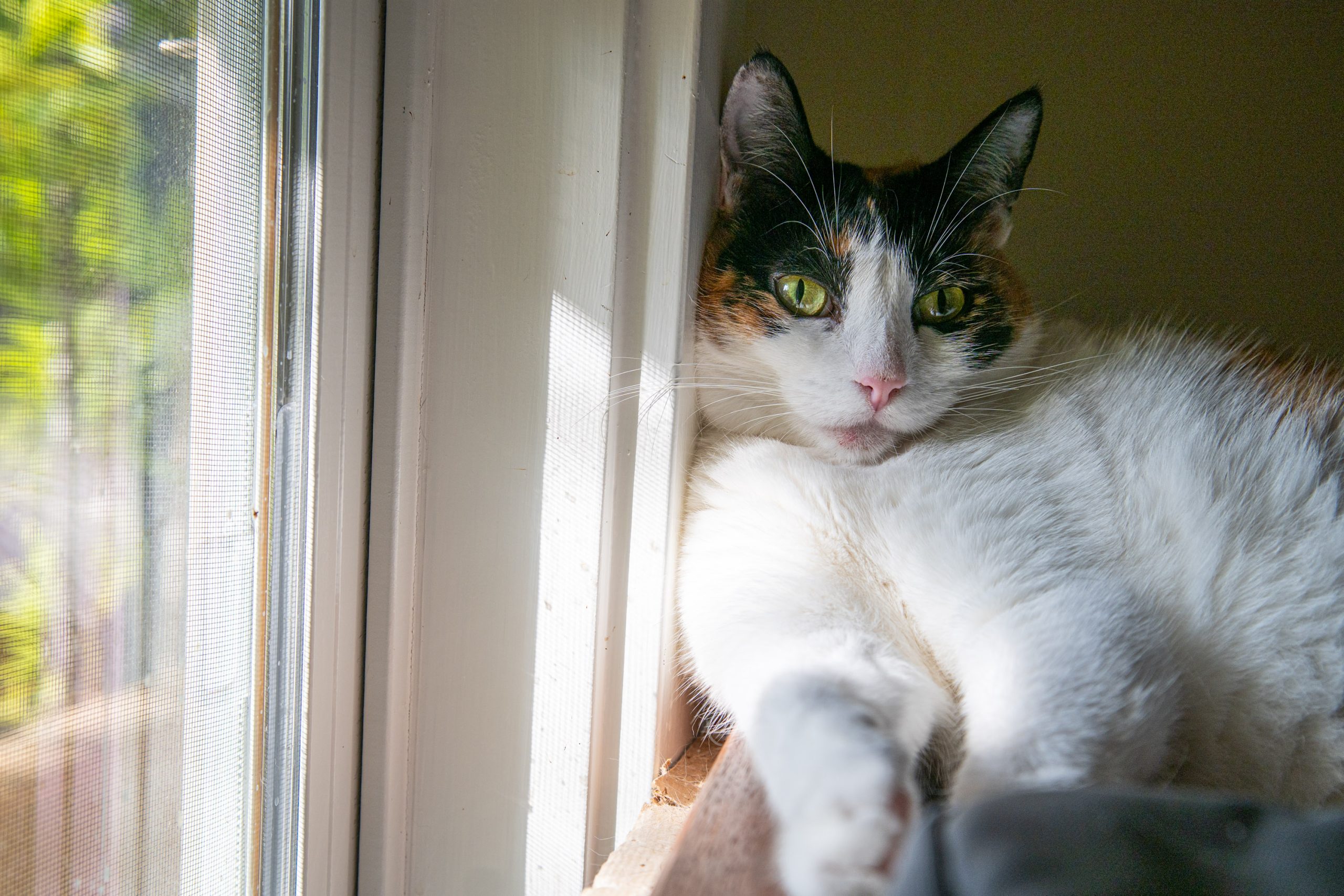 So I grabbed the cammera and a fast 50mm lens, and went hunting for additional poses. Luckily, I found Bessie up in one of her favorite spots, up on the top shelf in our pantry/storeroom where she can see out a window while feeling safe from being picked on by Kinikini (yes, he still chases her from time to time, but not as frequently as before). This turned out to be my favorite cat portrait of the week!