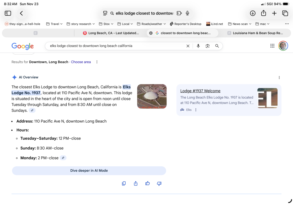 So as part of our planning, I asked Google something that seemed pretty straight forward. I searched for “Elks lodge closest to Long Beach California.”