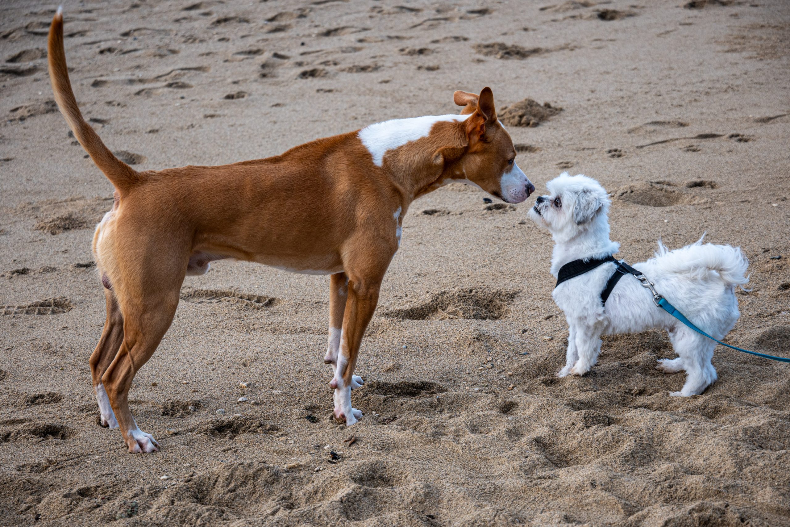 The shot of the morning. Bbeni had been back at the other end of the beach socializing with several other small dogs before finally heading home with his people. Meda and I were headed in the same direction. As we reach Waialae Beach Park, a big dog, unleashed, trotted over to check Bbeni out.