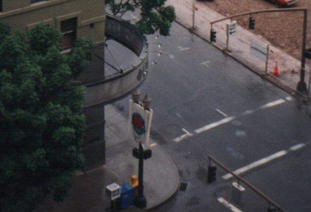 The photo, is seems, was taken from our room at the Hilton which looked out onto the corner of SW Taylor and Broadway. All the angles suddenly made sense, as we looked across to the construction site for Fox Tower, on the opposite side of Taylor Street.