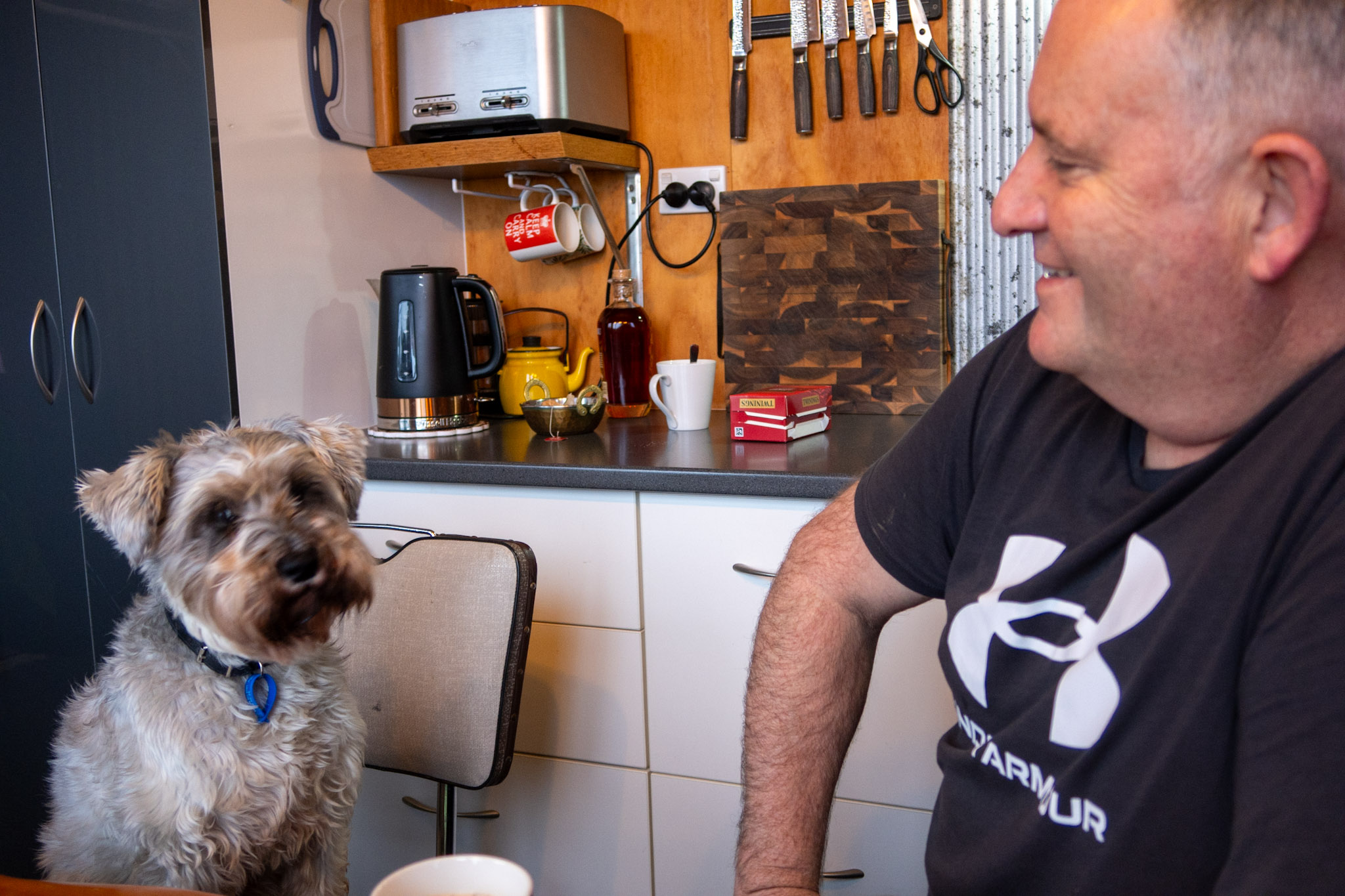 We then adjourned to their house for tea and conversation, where we received an excited welcome from Watson, shown here with Brad.