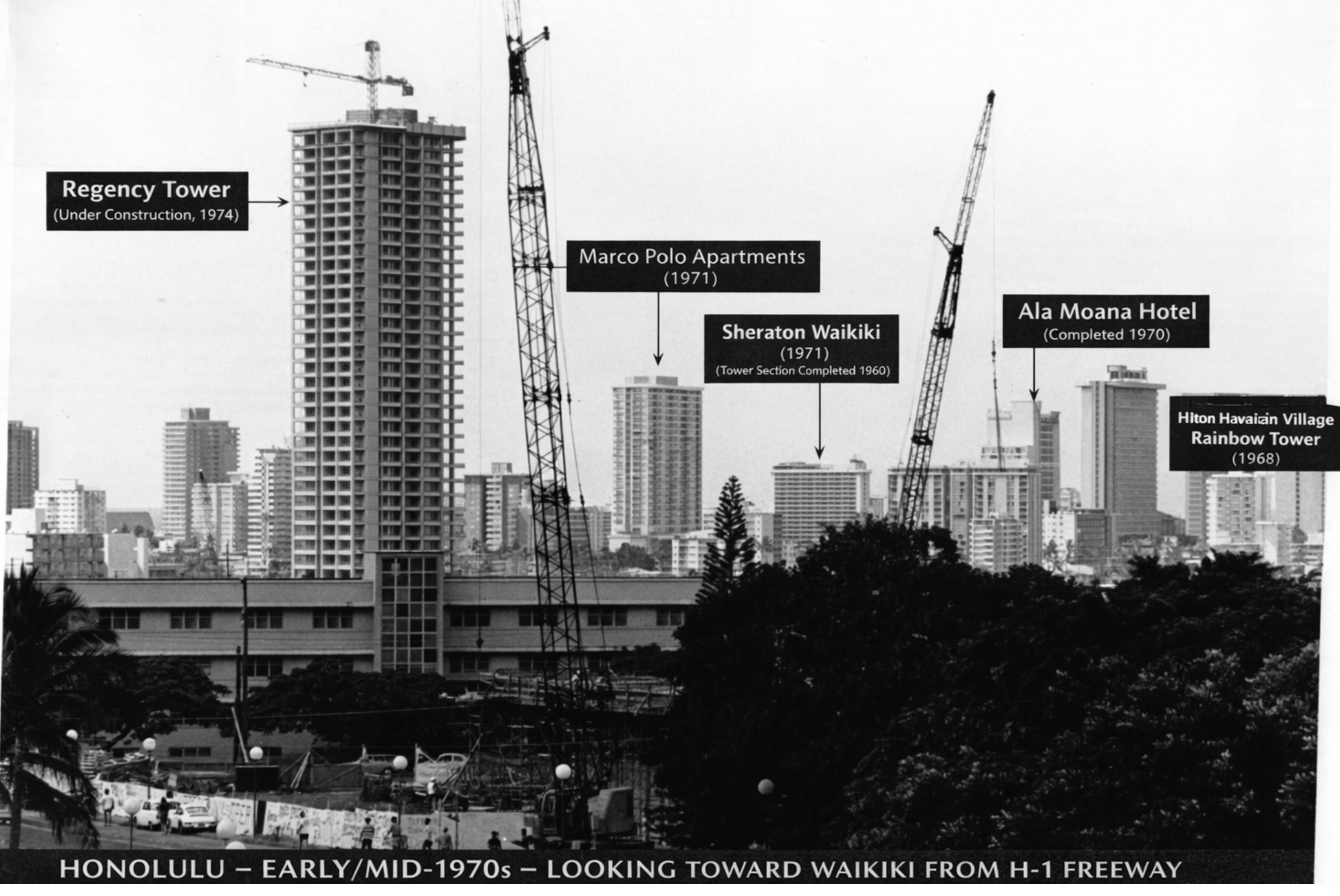 I’m thinking the photo might have been taken from a spot along the west-bound Kapiolani off-ramp from H-1, which could approximate the perspective.