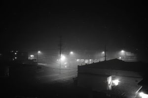Towards midnight, we went out by the elevator experience the thunder of all the fireworks, and I got this picture of the corner of 9th Avenue and Waialae, with the thick fireworks smoke very much in evidence.