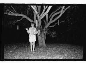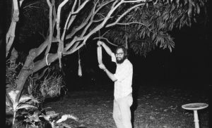 1962 My mother served a meal featuring laulau and poi at a table on the lanai that was covered with ti leaves from the yard. Joining us were my parents’ good friends, Charlie and Libana Crabb, and three of their four kids. I’m in back on the left stuffing my face. The mango trees, not visible in the dark, would have had at least some small strings of firecrackers ready to be set off at midnight, with some odds and ends to be lit by hand and tossed onto the grass earlier in the evening.