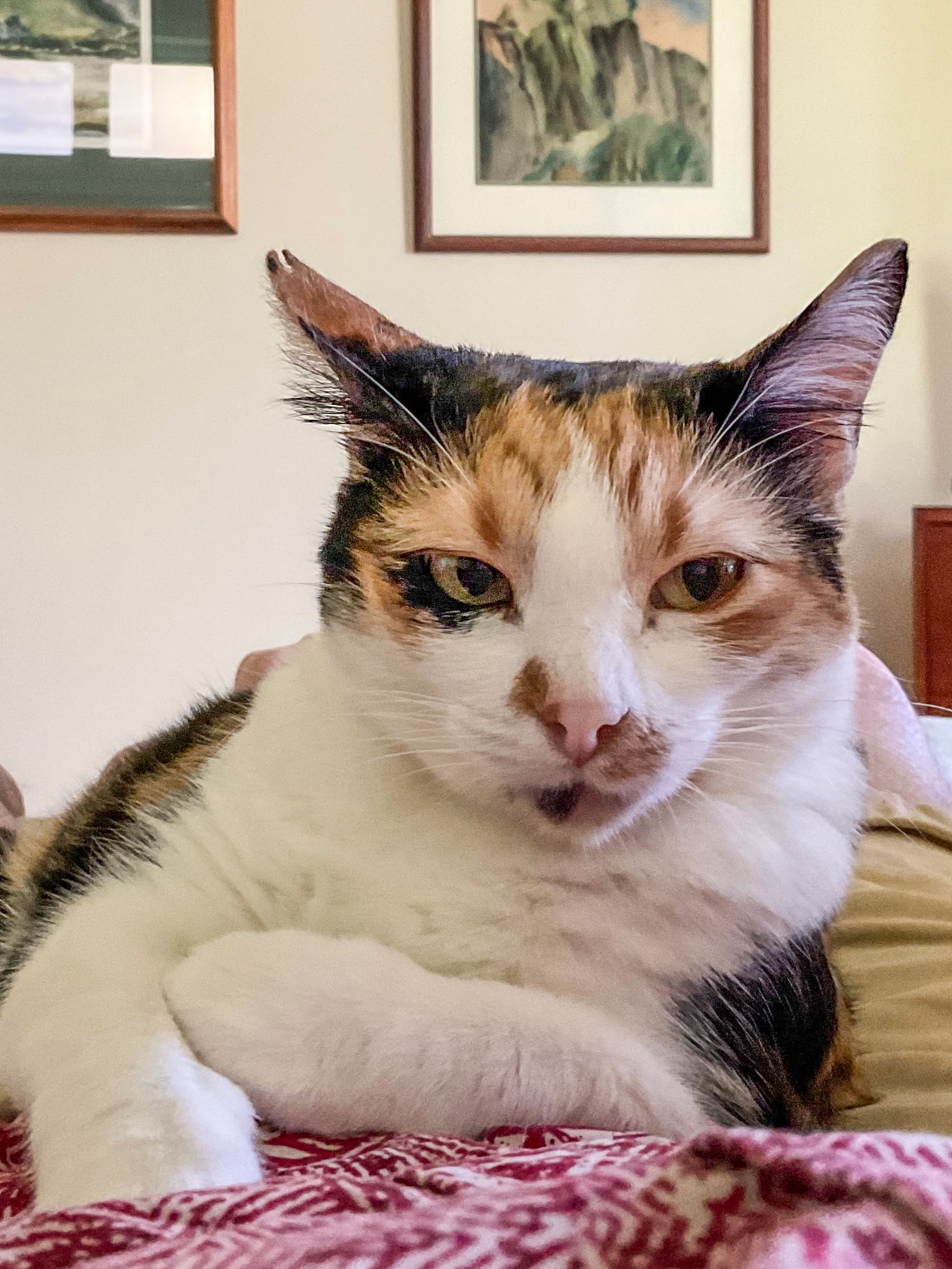 And here’s a photo taken this week after we returned from a week on the mainland. As soon as I lay down for an afternoon nap, she was there to claim the prime position in what would have been my lap if I had been sitting down. It was a matter of claiming her right to my full attention.